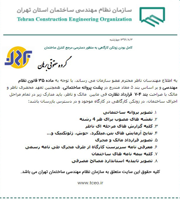 پیرو ابلاغ دستورالعمل مورخ 1396/08/03 سازمان نظام مهندسی ساختمان استان تهران می بایست مدارک اعلام شده در دستورالعمل در تمام مراحل اجرای ساختمان، در زونکن کارگاهی در کارگاه موجود و در دسترس باشد.
