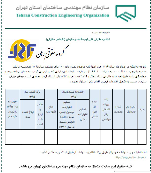 اطلاعیه مهم مالیاتی سازمان نظام مهندسی ساختمان استان تهران