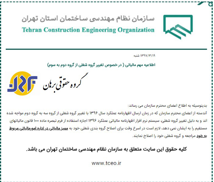 اطلاعیه مالیاتی سازمان نظام مهندسی ساختمان استان تهران درخصوص تغییر گروه شغلی از گروه دوم به سوم.